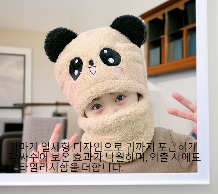 ● 귀마개 일체형 디자인으로 귀까지 포근하게 감싸주어 보온 효과가 탁월하며, 외출 시에도 스타일리시함을 더합니다.